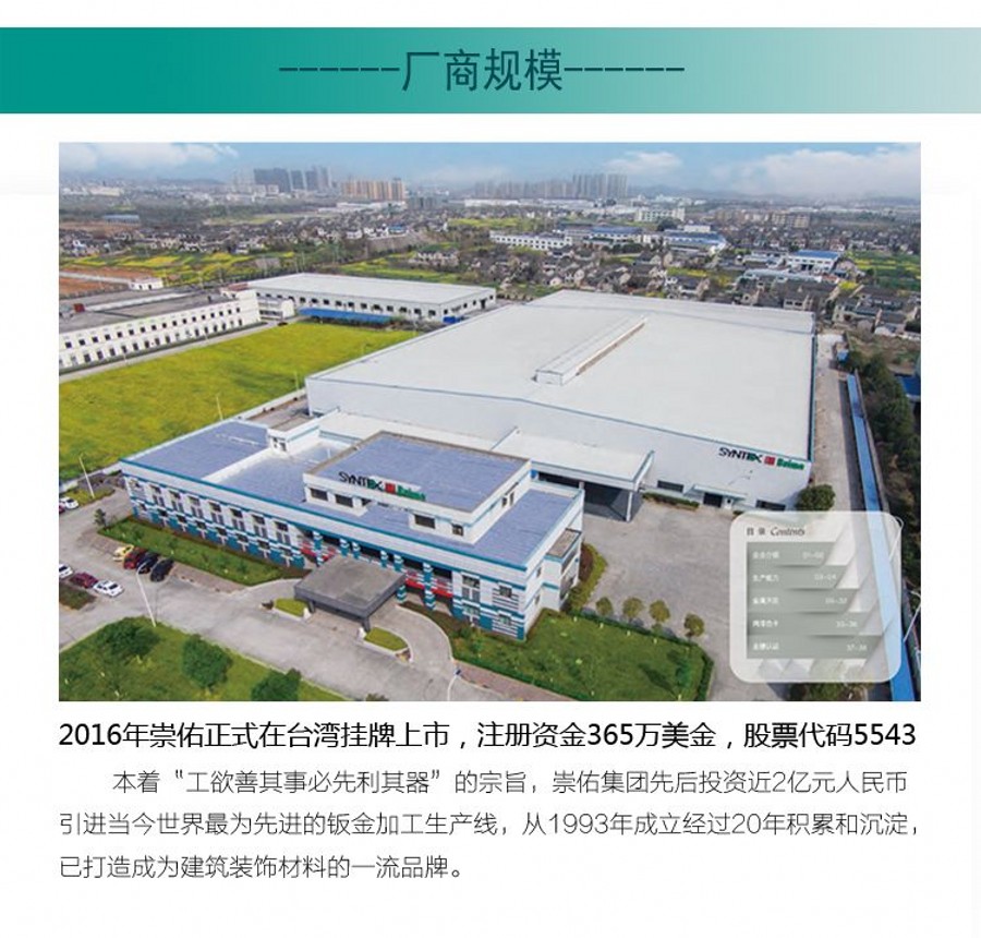 介紹:鋁天花、方板天花、微孔天花、鋼板天花、工程天花,嵌入式暗架係統和放置式明架係統,易拆卸,防塵隔音,崇佑品牌,行業知名品牌。