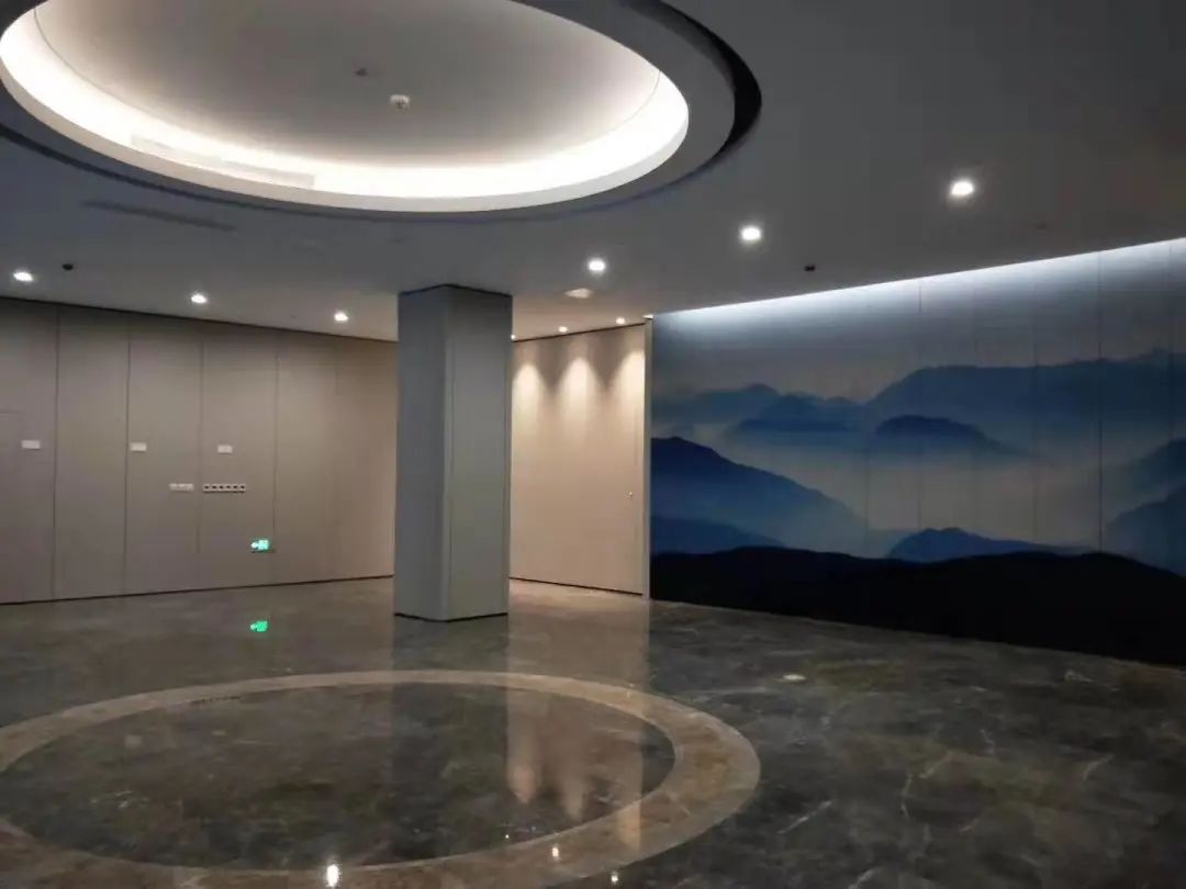 大樓主入口設置了鋁合金除泥墊,保持室內空間的症結,更具人性化。主入口的背景采用了以“星空下,山水間”為主題的造型牆,把設計概念落實到實處。大廳等候區采用多元化的家具組合形式,讓空間更加生動。