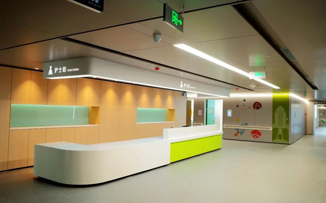 產科病房和兒科病房的牆麵一改以往單調的色調,以紅、綠、藍、黃等色彩使室內空間五彩斑斕,兒科病房的牆麵印刷上了許多的卡通圖案,使之既色彩豐富,又迎合了產科溫馨、兒科活潑的要求。